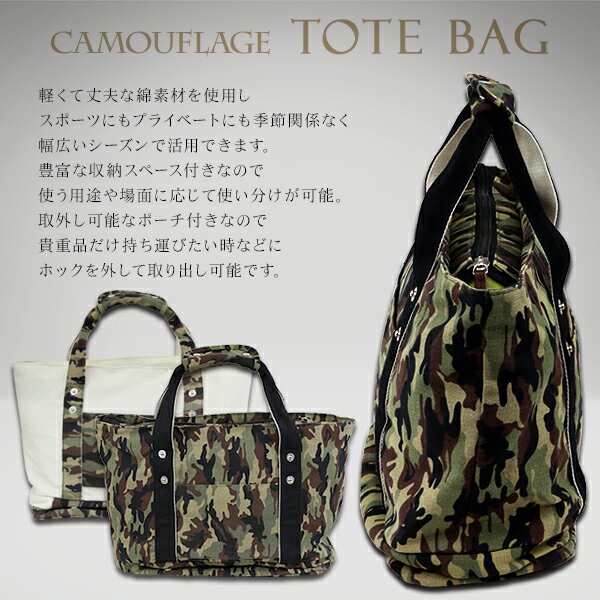 トートバッグ ファスナータイプ シューズ収納付き 男女兼用 キャンバスバッグ 商品説明 ・旅行やアウトドア、スポーツ、ジム通いや、海水浴、マザーズバッグなどなど、その他様々な場面で大活躍! たくさんの荷物が入る迷彩柄の多機能トートバッグです。